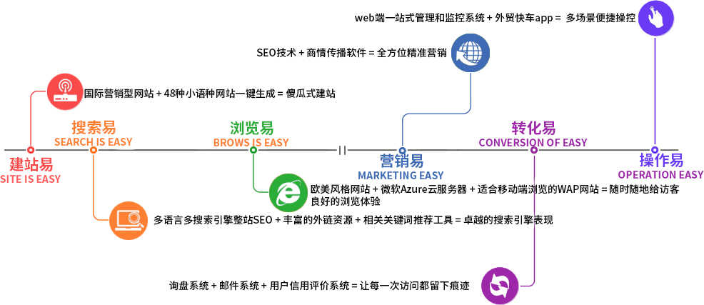 外贸快车智能建站系统从网站架构开始就全面植入了整站SEO技术,网站建成后自动开始SEO。关键词分析师帮助用户全面分析用户的行业和产品,规划出多数量高质量的核心关键词和长尾关键词,全面覆盖潜在采购商的搜索行为和习惯。48种语言的网站,分别对应google搜索引擎48种语言站点的SEO,并同步带动Bing, Yahoo, Ask, AOL, Yandex等其它主流搜索引擎的SEO。
