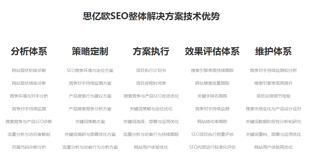 SEO整体解决方案技术是思亿欧在长达10年以上的搜索引擎优化服务经验中基于正确理解SEO、理解搜索引擎的前提下,提供的有别于单纯关键词排名服务的另外一种SEO服务。这种服务的理念是得到搜索引擎认可的。